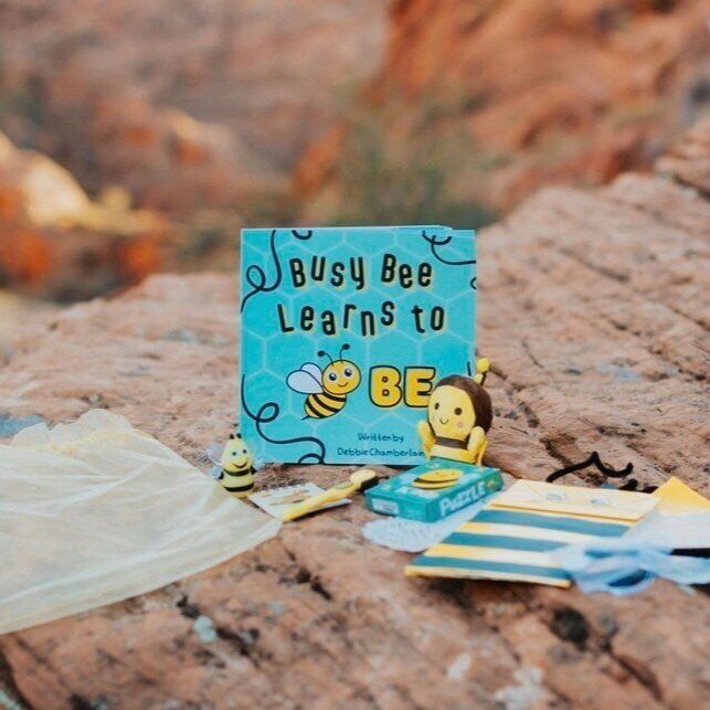 The kit includes Busy Bee Learns to Be, DIY bee craft with sample picture, bee journal and pen, puzzle, finger puppet, and stuffed key ring.