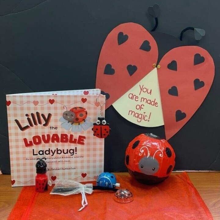 The kit includes Lilly the Lovable Ladybug, a DIY ladybug craft with a sample picture, a ladybug keyring, a blow-up ball, a sticker, a fidget, and a pop-up toy.